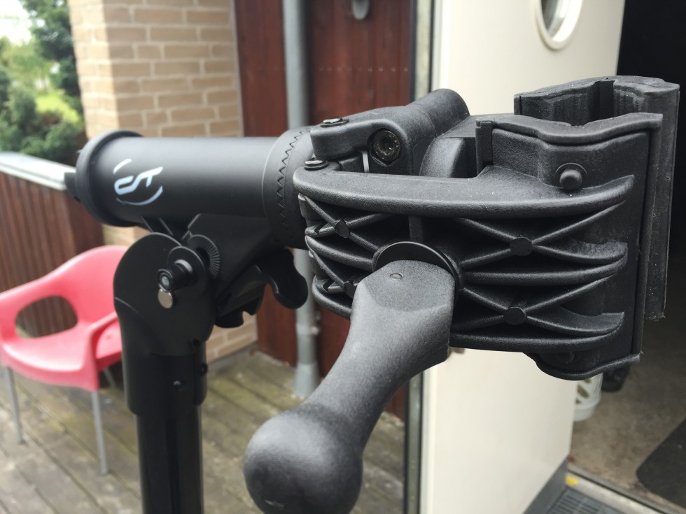 Kassen brun og kedelig, og måtte hurtigt over skulderen. Stativet er samlet fra fabrikken, og det betyder at det blot skal foldes ud, spændes sammen med quick-releases, og så er du klar til at nørde med mekanikken. Højden er passende, jeg bruger det i fuld højde, da jeg godt kan lide at kranken er i nogenlunde arbejdeshøjde, men det er meget nemt at ændre på. Sadelpinden er nem at sætte fast: åben kæben, ind med sadelpinden, drej grebet og du kan slippe. Hvis den giver sig lidt, drejes bare en omgang på grebet. Cyklens position kan nemt reguleres, så den kommer i vandret, hvis det ønskes. Her er der valgt en løsning med at vinklen styres med et greb, hvor de to dele har tænder som griber ind i hinanden. Det gør at når man klikker den ind, bliver den i positionen, og kan ikke rokkes derfra. Fed feature. Stativet virker rigtig stabilt. Min cykel er ikke en letvægter, men heller ikke i den helt svære klasse. Ved indjustering af gear, hvor der køres med god kadance på pedalerne, og gearene køres igennem, er der ingen slinger i valsen. Stativet er i let stål. Plasten virker stabil, ser ikke prangende ud, men gør et godt job. Det tager kun et øjeblik at klappe sammen, så kan du have det med i bilen, når sporene i Harzen eller Hammer Bakker kalder.