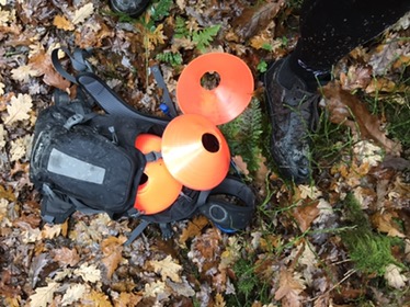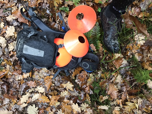 I skoven havde vi i forvejen aftalt at vi ikke ville køre på fugtfølsomme dele af sporet, og fandt hurtigt hen til en lidt bred skovvej, hvor der blev lagt kegler ud i passende mellemrum, og så ellers trænet svingteknik. Ekstra dimension med løse blade og fugtigt underlag, men kanon træning. Krydret med lidt bakketræning hver gang vi skulle op til start, så en rigtig fed træning også. Det fungerer sådan at der er en som er “spotter” og retter på de andre. Kigger på fodstillingen, kommer man langt nok ned og giver feedback på hvordan vi klarer svinget eller øvelsen. Det kan man snildt skiftes til, og hvis man ønsker lidt mere håndgribelig feedback, kan det anbefales at bruge mobilen til videooptagelse, optimalt med slowmotion.