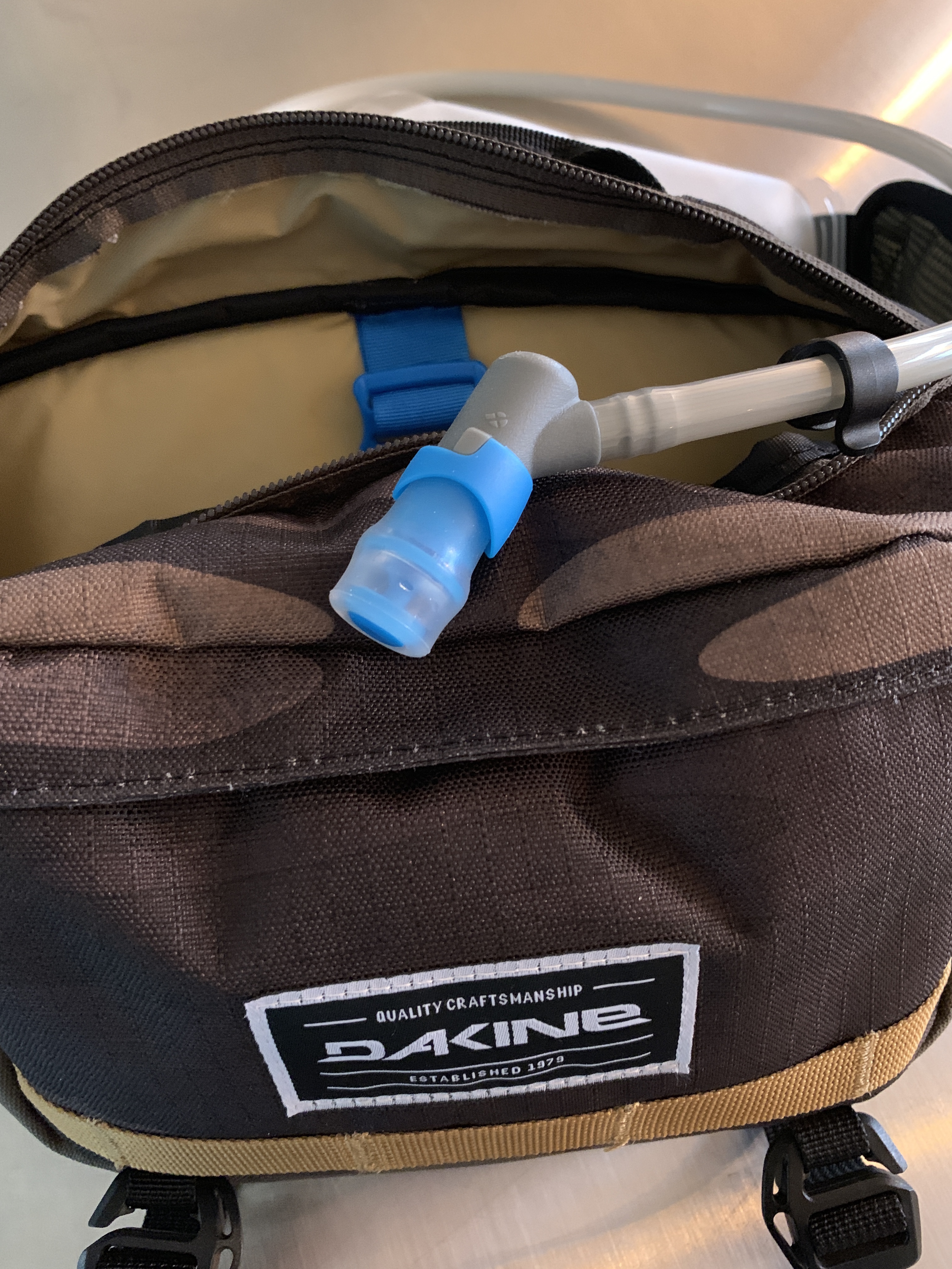 Tasken fra amerikanske Dakine virker som alt andet fra firmaet som solid kvalitet. Stoffet er kraftigt, lynlåsene solide og alt virker fornuftigt tænkt. Der medfølger en drikkeblære fra HydraPak, som til forveksling ligner dem fra USWE, dvs samme mundstykke, slange, lukkermetode og samlinger. Jeg har valgt en model i Camo farver, og jeg synes at den visuelt er super cool.